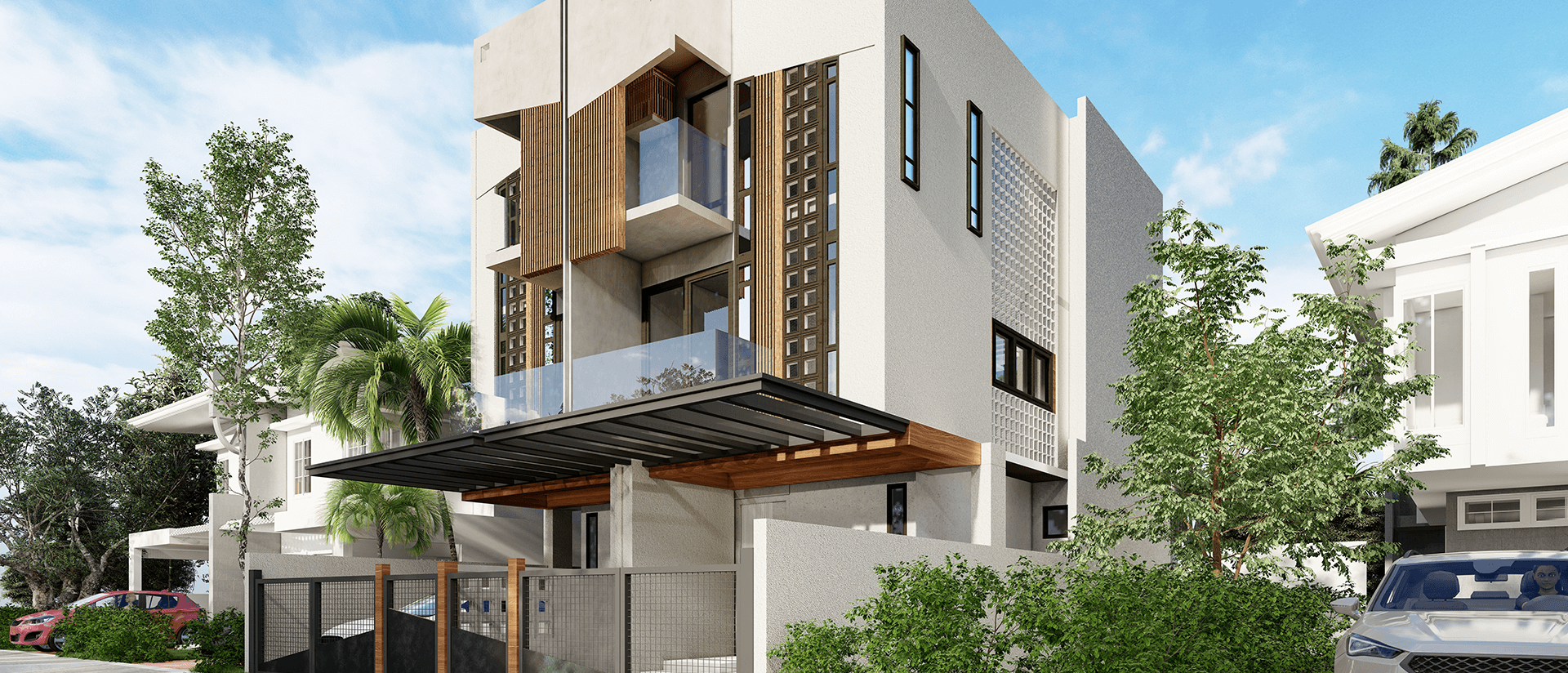 In sleepy Antipolo, an empty 145-sqm lot becomes the foundation of a duo of modern three-storey residential houses that stands out with a contemporary take on lines and a play on elevations. It starts with a unique façade that uses angled lines and a mix of textures—light-colored concrete, glass blocks, wood, wire mesh; a theme that extends indoors to provide a unique living space that’s generous with natural light and air while also ensuring maximum privacy.